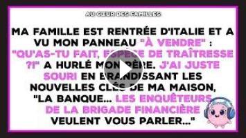 Ma famille est rentrée d'italie et a vu mon panneau "À vendre" : "Qu'as-tu fait, espèce de traîtresse ?!" A hurlé mon père. J'ai juste souri en brandissant les nouvelles clés de ma maison, "La banque... Les enquêteurs de la brigade financière veulent vous parler..."